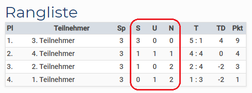 Beachten Sie bitte, dass trotz der Deaktivierung der Ranglistenanzeige, die Ränge weiterhin intern berechnet werden. Dies ist notwendig, um andere Funktionen der Seite sicherzustellen, wie zum Beispiel die Übernahme von Teilnehmern in nachfolgende Runden oder Turniere. Auch wenn die Ränge nicht angezeigt werden, sind sie also im Hintergrund weiterhin aktiv und wirken sich auf den Turnierverlauf aus.