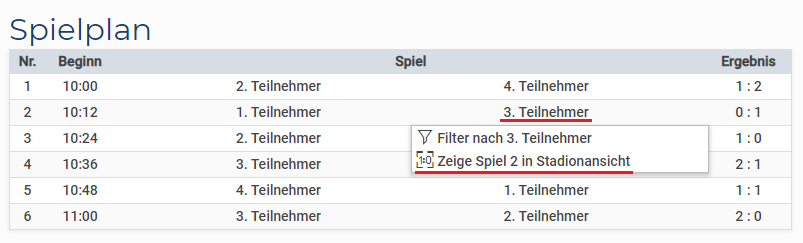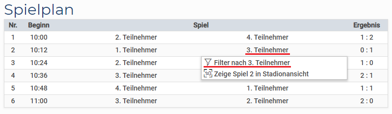 Über die Auswahlfelder Gruppe, Spieltage und Spielnummer lässt sich eine Auswahl treffen, welche Spiele tatsächlich angezeigt werden. Hier kannst du eine Gruppe oder einen Spieltag auswählen (Spieltage lassen sich nur bei Ligen auswählen und Gruppen nur, wenn es eine Gruppenphase gibt). Außerdem lässt sich die Darstellung nach Teilnehmern filtern, wobei jedoch die Auswahl eines Teilnehmers dazu führt, dass die Auswahl einer Gruppe ignoriert wird. Das Filtern nach einem Spieltag hingegen ignoriert das Filtern nach einem Teilnehmer.
