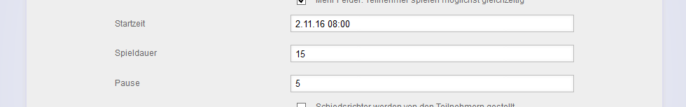 Darunter kommen die Einstellungen zur Zeit. Hier kannst du die Startzeit, die Dauer pro Spiel und die Pause zwischen zwei Spielen festlegen. Ich möchte, dass mein Turnier um 8 Uhr morgens beginnt, ein Spiel 15 Minuten dauert und zwischen zwei Spielen fünf Minuten pausiert wird. Lies dazu auch Datum und Zeit von Spielen einstellen. Das sieht dann so aus: