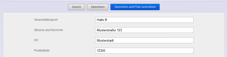 In den oberen vier Feldern kannst du den Veranstaltungsort, die Straße und Hausnummer, den Ort (die Gemeinde oder die Stadt) sowie die Postleitzahl festlegen. Das kann zum Beispiel so aussehen: