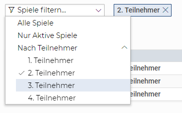 Über die Auswahlfelder Gruppe, Spieltage und Spielnummer lässt sich eine Auswahl treffen, welche Spiele tatsächlich angezeigt werden. Hier kannst du eine Gruppe oder einen Spieltag auswählen (Spieltage lassen sich nur bei Ligen auswählen und Gruppen nur, wenn es eine Gruppenphase gibt). Außerdem lässt sich die Darstellung nach Teilnehmern filtern, wobei jedoch die Auswahl eines Teilnehmers dazu führt, dass die Auswahl einer Gruppe ignoriert wird. Das Filtern nach einem Spieltag hingegen ignoriert das Filtern nach einem Teilnehmer.