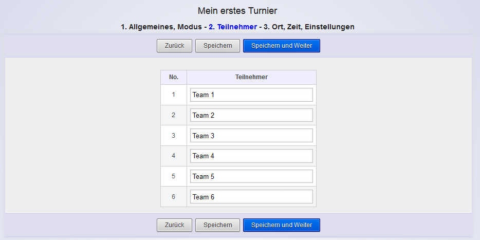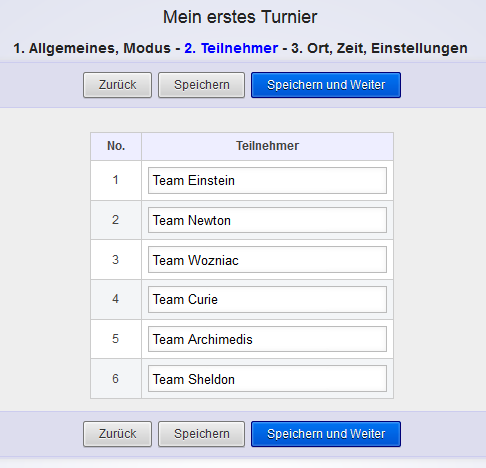 Trage hier nun die Vereinsnamen ein von den Vereinen, die an deinem Turnier teilnehmen. Wenn du gerade nicht alle Teilnehmer kennst, klicke zwischendurch auf Speichern, um deine Arbeit zu speichern – du kannst dann jederzeit hier her zurück kommen. Du kannst auch schon in den nächsten Schritt gehen und später hier her zurück kommen, indem du den Zurück Knopf benutzt. Bei mir sieht es jetzt so aus: